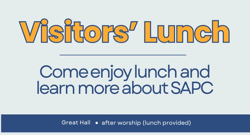 Newer to SAPC? Interested in learning more about this community or wondering about how to connect further with the SAPC family? Anyone interested is invited to join us in the Great Hall, immediately following worship. Lunch will be provided. This informal gathering is simply a way to get to know us better and ask any questions you may have about St Andrews.